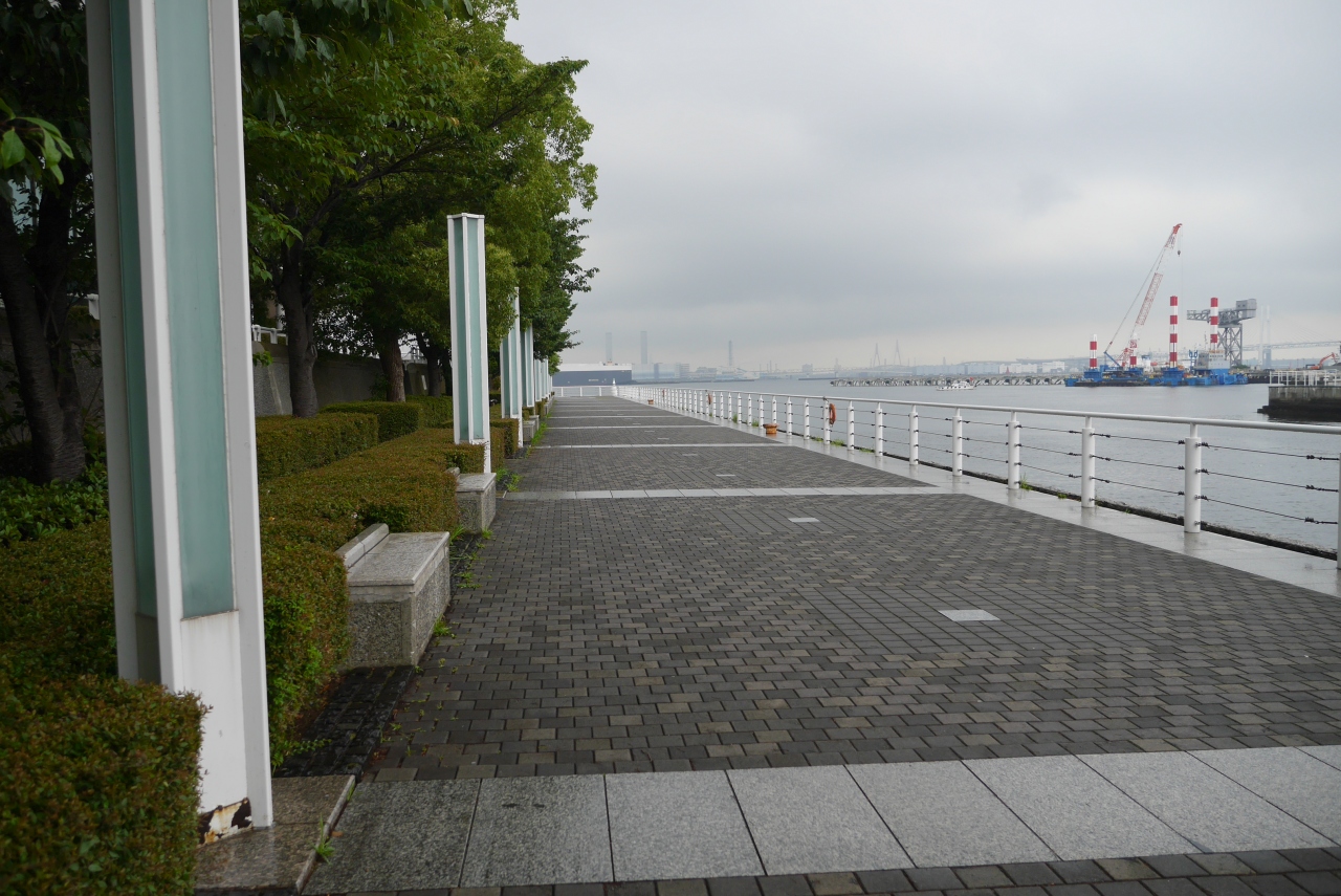 みなとみらい駅から2階の通路を歩くと各施設が広がっています。ホテル側には会議センターがあり、その裏側、横浜港側は遊歩道になっていました。湾内のクルーズ線発着所でもあるぷかり桟橋が海に浮かび、臨港パークまで海辺の散策を静かに楽しめました。