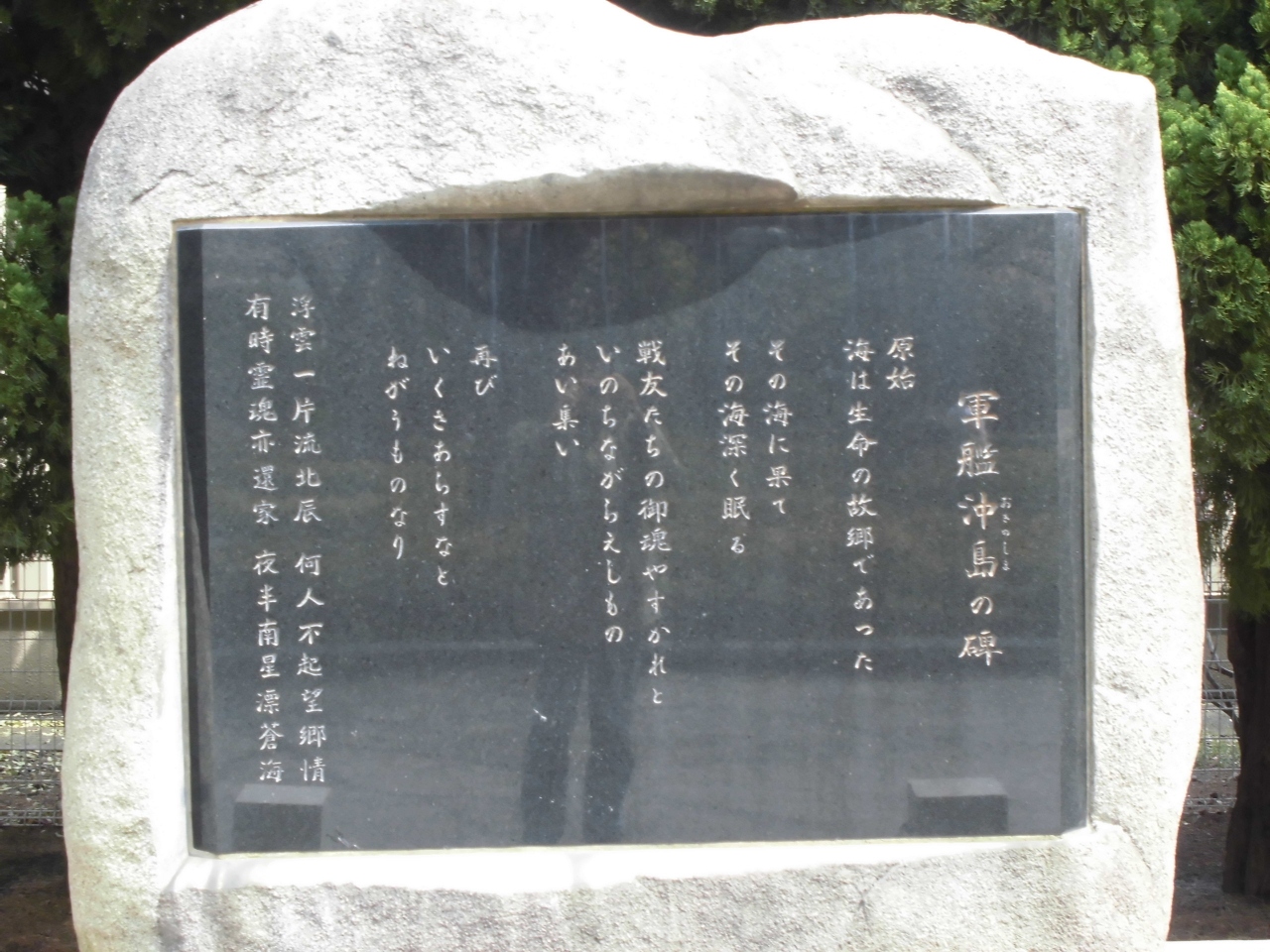 横須賀のヴェルニー公園にあります。この碑は詩が彫られています。その内容を見ると軍艦沖島は沈没をしてしまったようです。形に特徴のある他の碑に比べるとちょっと目立たないのが難点ですが、見たほうがいいと思いました。