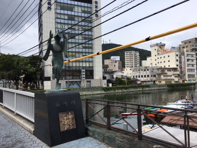 徳島市内の真ん中を流れる新町川に架かっている橋の一つです。徳島中央公園から阿波おどり会館へ行く途中に立ち寄りました。この辺りから新町川水際公園が続いています。橋の欄干には、阿波踊りをする人の姿の像が建って居て、徳島の雰囲気を出していました。