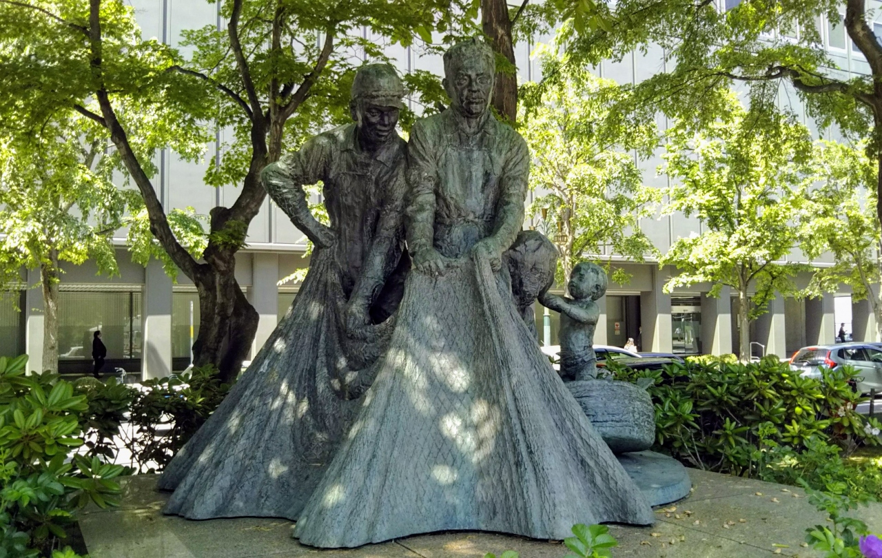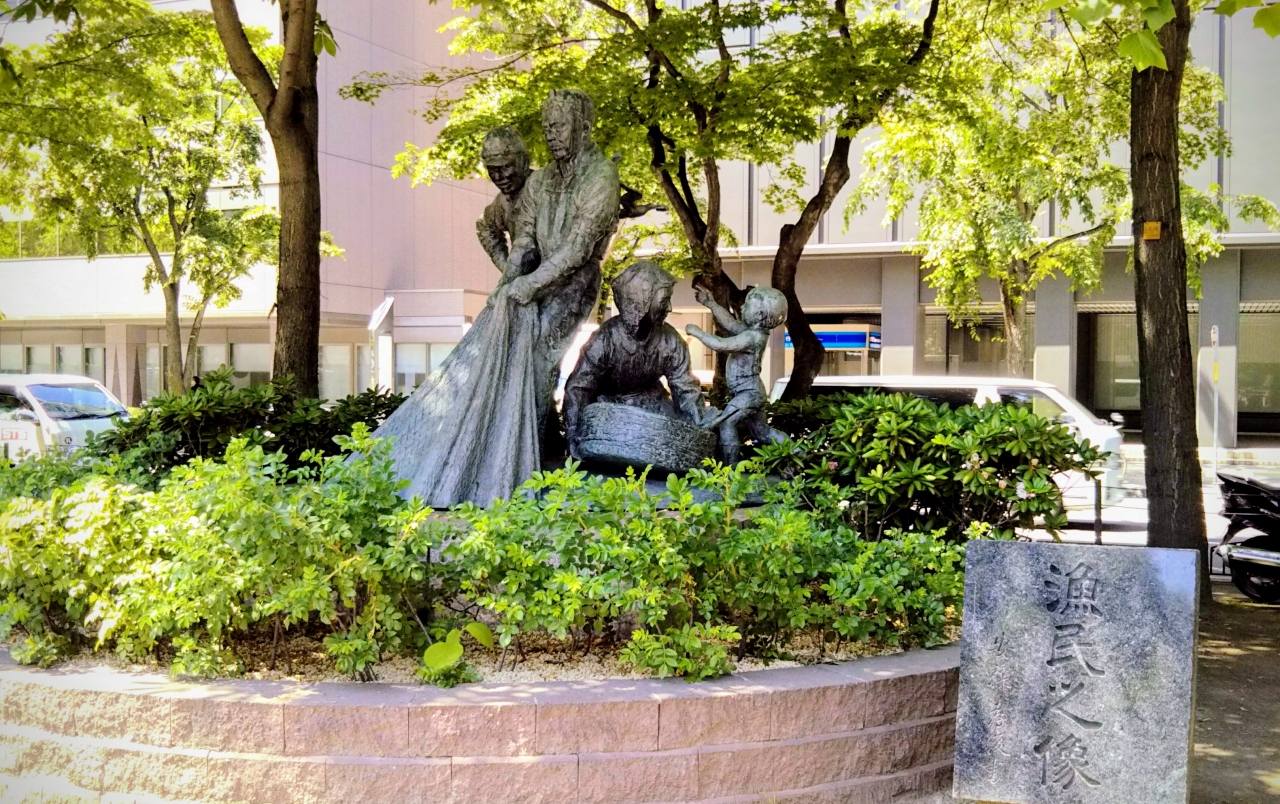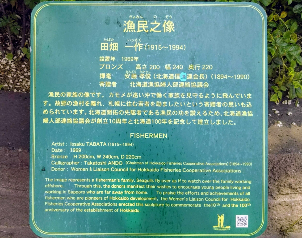 大通公園西7丁目にある 田畑一作 作の『漁民之像』は、昭和44年(1969年) 北海道開拓100年と北海道漁協婦人部連絡協議会の創立10周年を記念して建てられた像です。