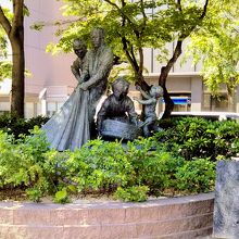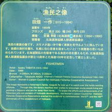 漁の網を引く漁師たちと 子供の世話をしながら作業を手伝う母の姿に、厳しい風雪に耐え、北海道の開拓と漁業の発展に貢献した祖先を敬う気持ちが込められた力強い像です。