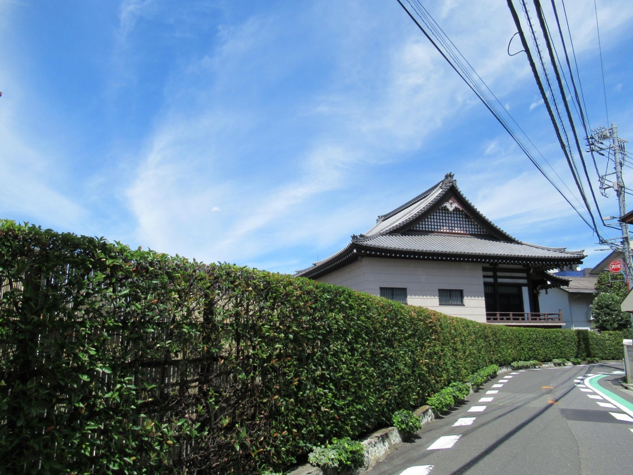 生垣越しに瓦葺きの大きな本堂が見える寺院です