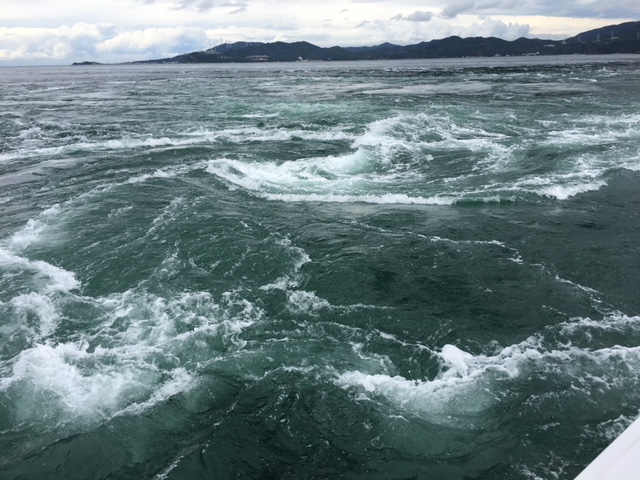 うずしお汽船に乗ってうずしおを見に行きました。大潮は午前中の早い時間だったので、間に合いませんでした。午後の中潮の時間に乗りました。鳴門にはいろいろなうずしおの観測船があるようですが、このうずしお汽船はうずしおのすぐ近くまで行ってくれるので迫力がありました。