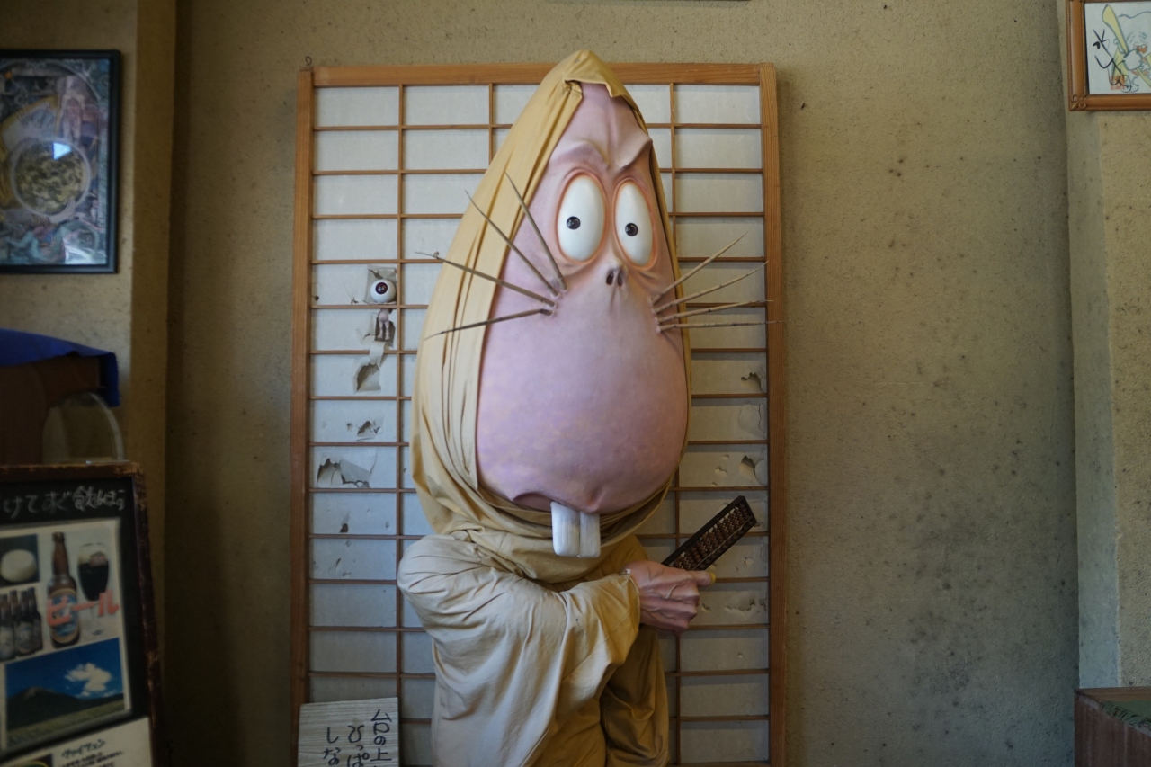 工芸館むじゃらは、水木しげるロードの中ほど。工芸館という名前のとおり、ここにある妖怪たちのキャラクターグッズはマジにリアル。破れた障子の前に立つねずみ男の人形とかもう最高。これを見るために寄っても価値ありくらいの傑作だと思います。
