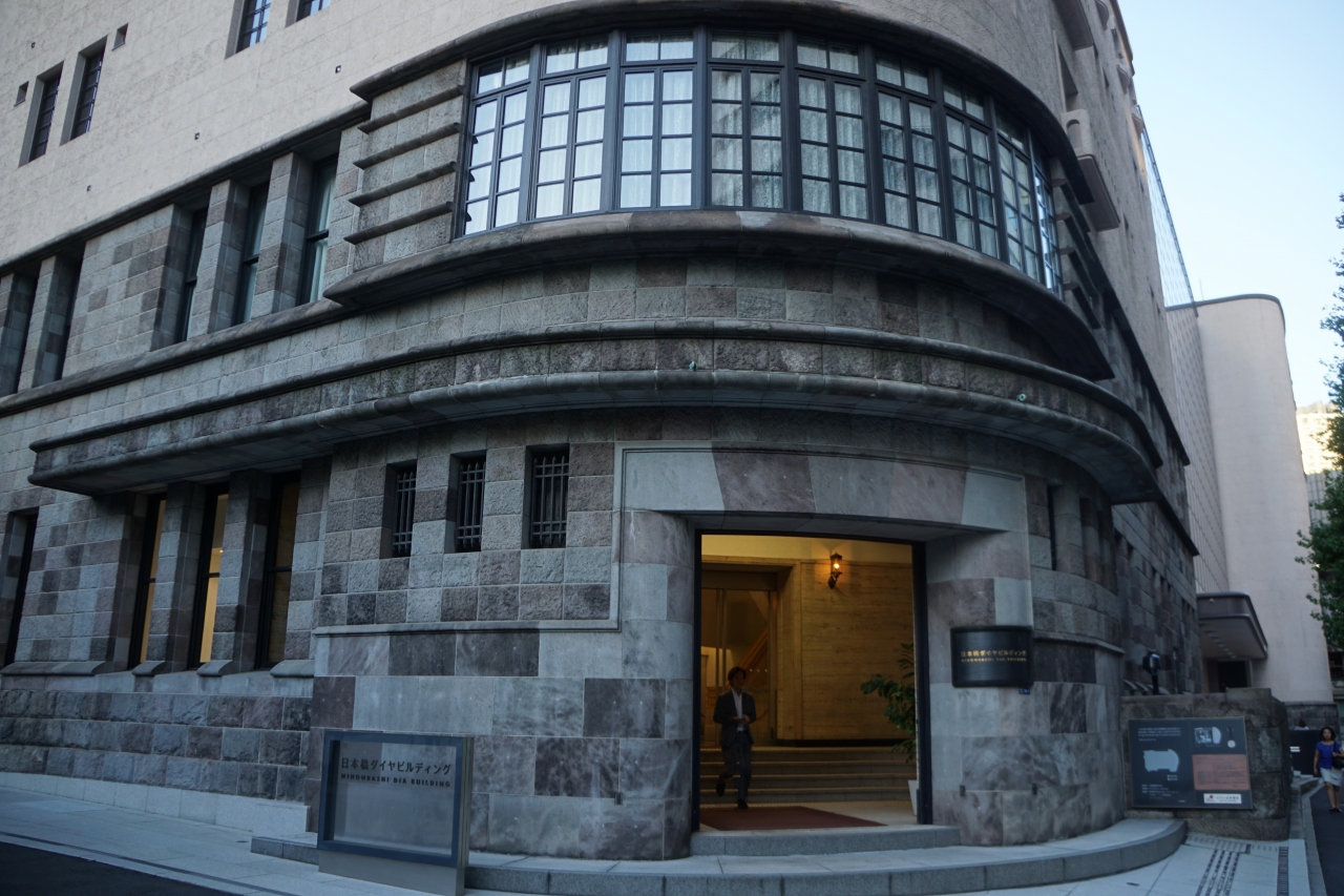 三菱倉庫江戸橋倉庫ビルは、江戸橋のたもと。遠くから見ると上層のモダンな建物が美しいですが、下層を見ると昭和5年に建てられたかつての堅牢な石造りの建物が残されています。三菱倉庫はここに明治13年三菱汽船の倉庫が建てられ、三菱の倉庫部門の会社としては明治20年に独立したもの。そういう意味では歴史的な場所でもあるようで、それにふさわしい建物かなと思います。