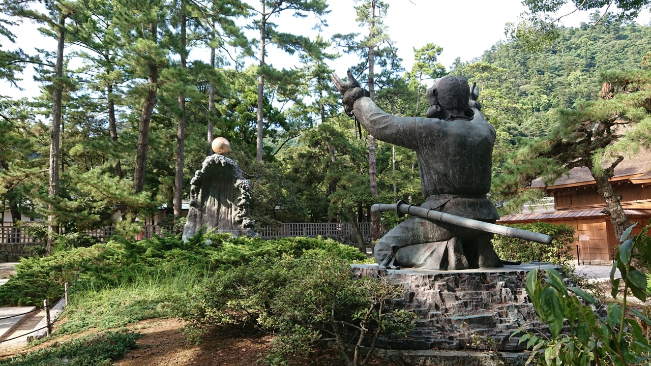 高い波に乗って打ち寄せる魂を受け取って神になるシーンを再現しているそうです。本殿からちょっと南へ行ったところにあります。この作品を造った人が想像した魂は金色の玉なんですね。両手を広げて大切なものを受け取ろうとしている様子がわかります。