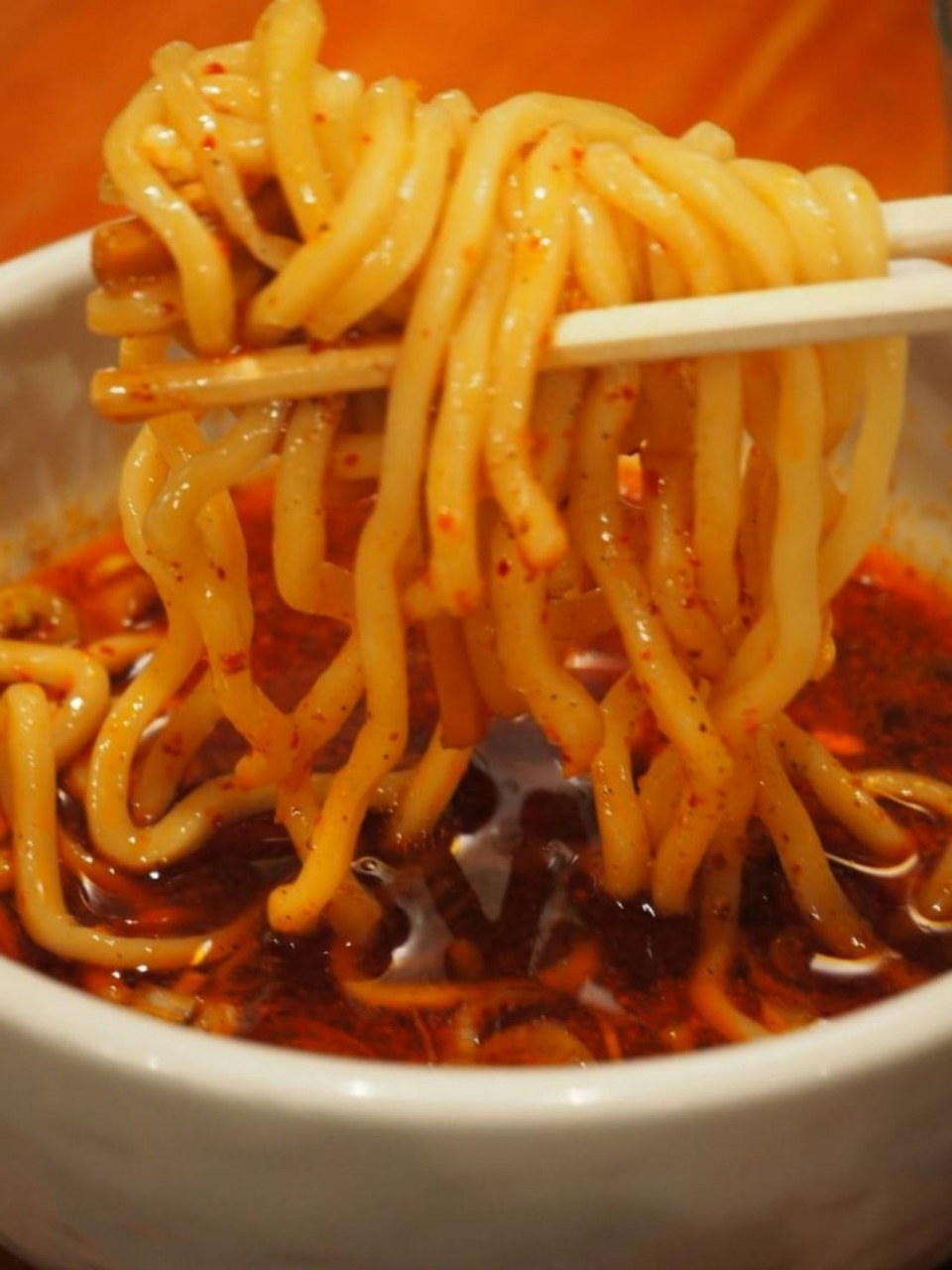 三河屋製麺所のムニムニ食感のコシがある麺に、つけ汁は一味、ラー油、山椒、お酢などが効いたものでとにかく辛酸っぱい!!