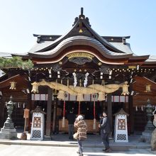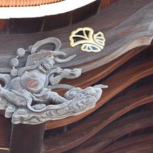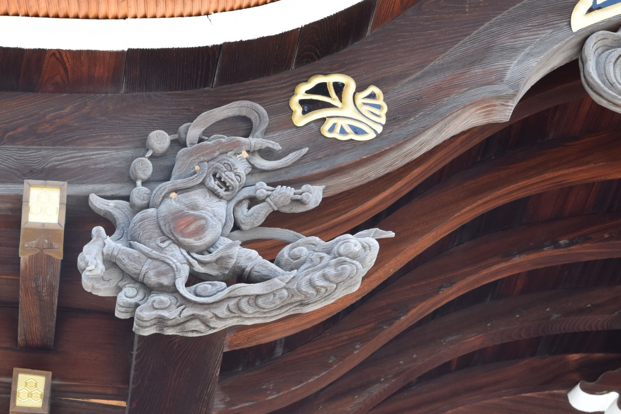 拝殿の破風にある、木彫りの風神雷神が