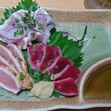 生ビール、焼酎ロック、鳥刺し三種、ももの溶岩焼きをいただきました。