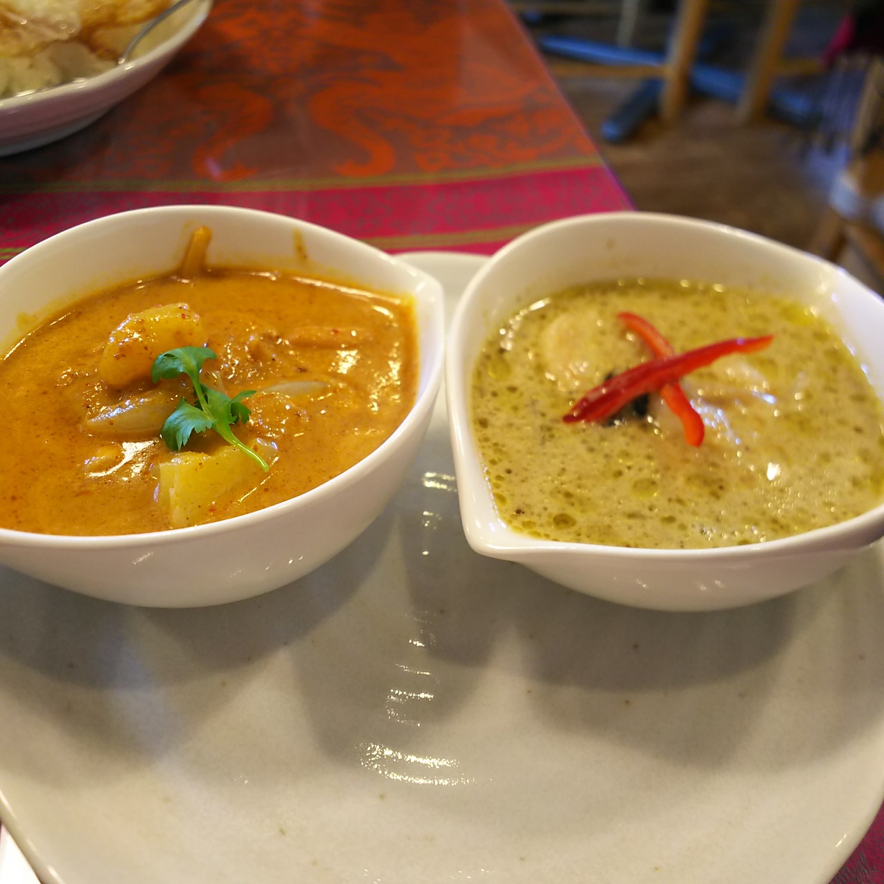 ランチに行きました。ダブルカレーのランチセットとガオパオとヌードルのランチセットを注文しました。前菜付で特にヌードル付のはかなりボリュームありました。ほどよく辛く、タイにいったことないので本場とは比べられないけど、美味しかったです。駐車場がかなり狭いので軽自動車でないと、私は無理でした。あと、店内は狭く席が少ないので予約して行かれることをオススメします。