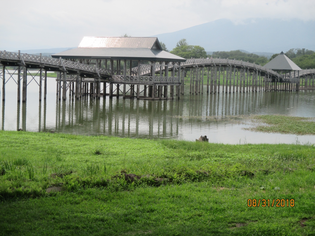 樹齢150年の青森県産「ひば」で造られ、直径が30cmあるという一連の橋桁が、曇り空で白い湖面に映し出されていました。天気が良ければ、青い湖面に津軽富士・岩木山が映し出されるはずですが、今日はあいにくの曇り空で見えませんでした。