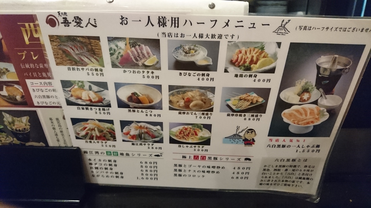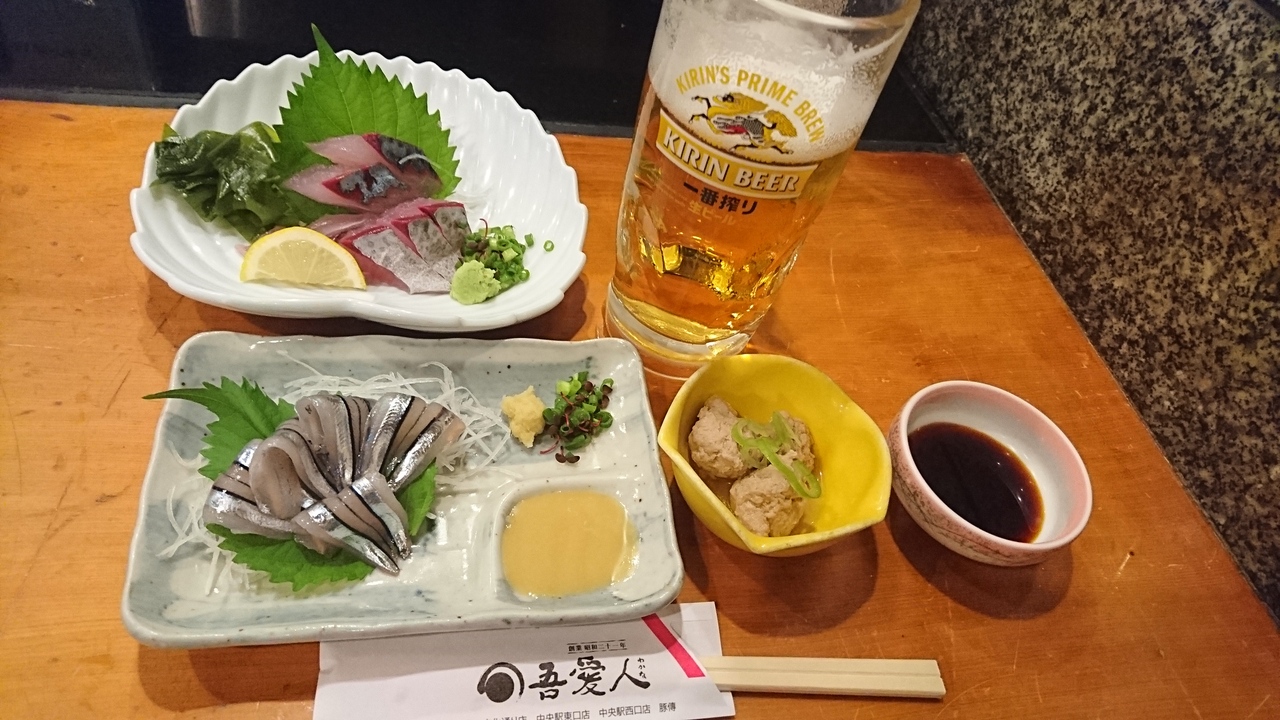 生ビール、芋焼酎ロック、きびなごの刺身、首折れサバ、おでんをいただきました。