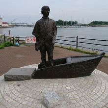 金森赤レンガ倉庫街から緑の島へ向かう途中の小さな公園内にブロンズ像はありました。函館湾内に停泊しているアメリカ船まで、この小さな船に乗って向かったようです。