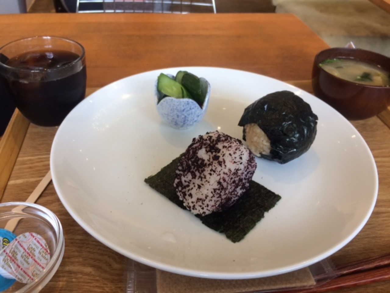 大きなお皿に おにぎり2つと胡瓜の漬物、そしてほっこりお味噌汁。
