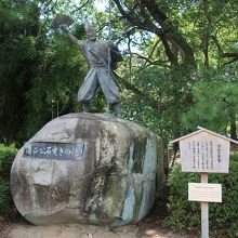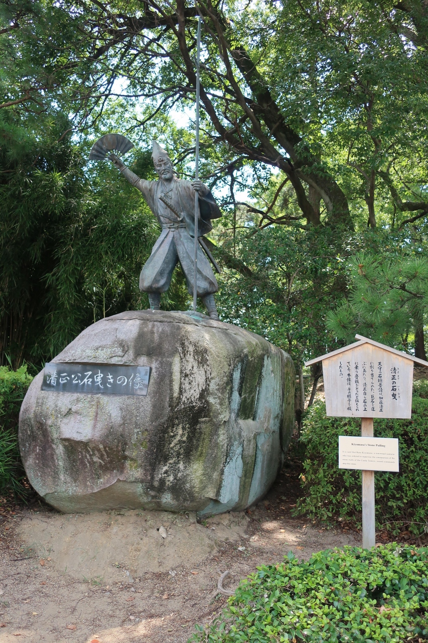名古屋城の東南隅櫓の南側に名古屋城内唯一の像があります。それが清正公石曳き像です。大きな石の上に扇を持って、石を曳く音頭をとる姿を模した像の姿が、勇猛の姿の武者像とは一味違って少しユーモラスです。でも、実際に加藤清正自ら石曳きを先導したとは思えないです。