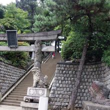 新馬場駅から近い品川神社は鳥居を抜けるとすぐに急な石段が続き、それを上がって拝殿の方へ進みます。なかなか急な石段ですが、途中で左に曲がると富士塚の方へ進むことが出来て塚の裏側からもアクセスできるのでそちらを通ったほうが楽です。