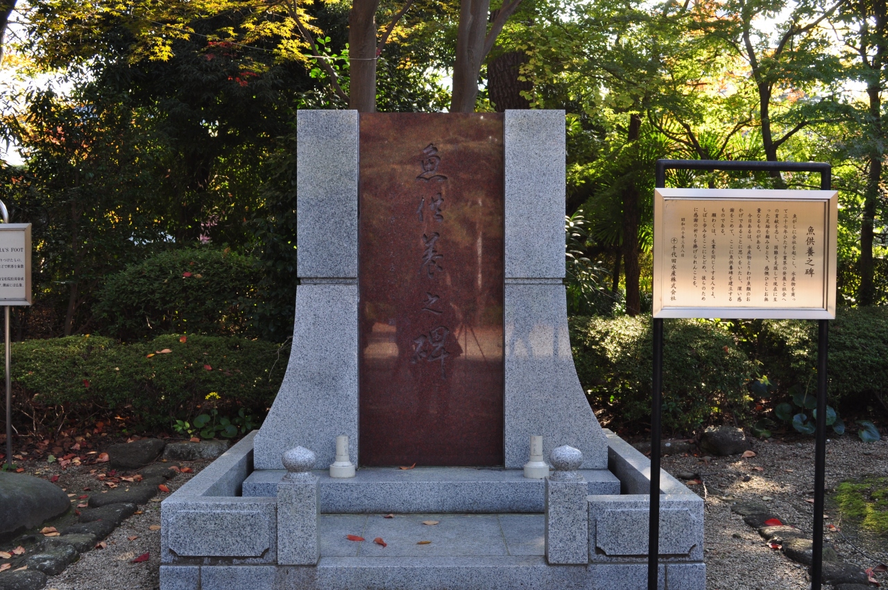 増上寺の三解脱門を入ると左右にたくさんの石碑などが並んでいるのですが、そのうちの一つがこの「魚供養之碑」になります。千代田水産株式会社によって昭和60年に建てられた供養塔のようです。生業の元となった魚に対する敬意というものを感じはしましたが、なぜ増上寺に?という疑問はわきました。どうせなら築地とかに置けばいいのにと思ってしまいます。