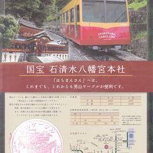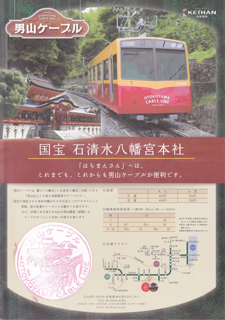 京都府の八幡市駅と男山山上駅を3分で結ぶ、京阪電鉄のケーブルカー。大人片道200円、往復400円。平日・土曜・休日に関わらず毎日始発は7:40、最終は18:45、その間ほぼ毎時15分と45分、それ以外に毎時きっかりと30分にも乗客がいれば運行されるそうです。