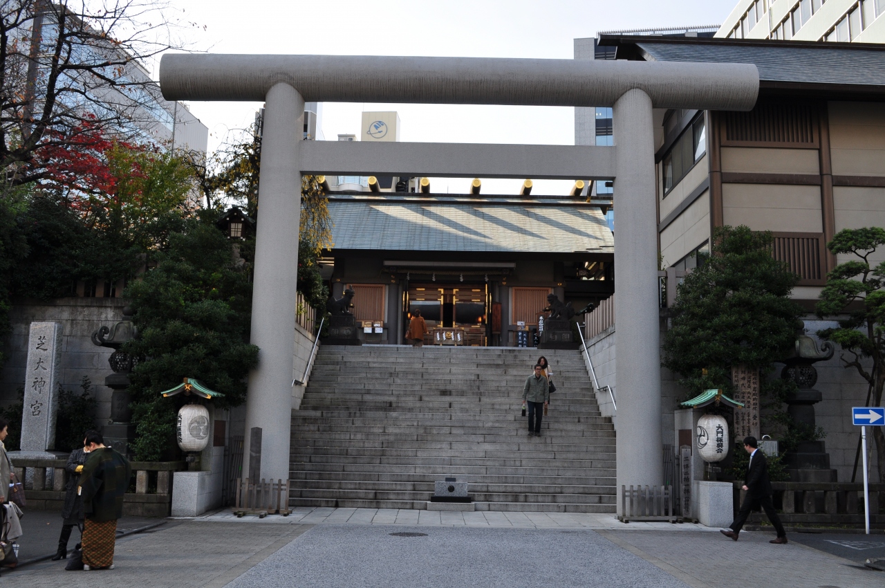JR浜松町駅と増上寺の中間付近、大門駅から徒歩数分の場所にある神社です。創建は1005年という事で、千年以上の歴史があるとても由緒のある神社になります。港区という都会にあり、周辺はビルに囲まれているにもかかわらず、境内に入るととても静かで落ち着いた雰囲気がありました。生姜塚や貯金塚など珍しい塚もあって、なかなか楽しめる神社です。とても大きな鳥居が印象的でした。