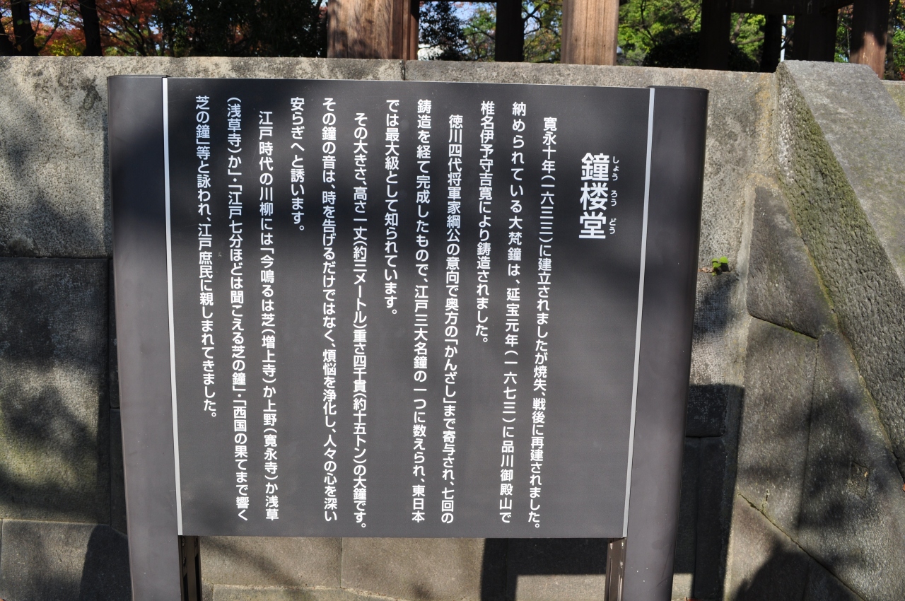 港区の増上寺境内にある鐘楼になります。鐘楼堂は1633年に創建されたそうですが、焼失、戦後再建されたものだそうです。中にある鐘楼は1673年に造られたものがそのまま残っているようです。非常に大きな鐘楼で、江戸三大名鐘として知られていたようです。確かに大きな鐘楼で、江戸時代などあまり大きな音を出すものがない時代だったら遠くまで音が響くだろうな、と思いました。