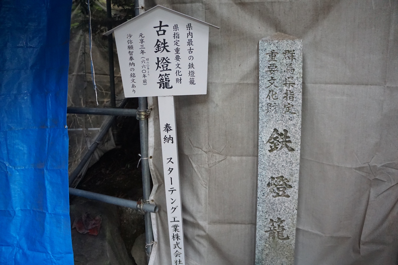 榛名神社の鉄燈籠は、神社の一番奥、本殿のエリア。額殿国祖社の脇にあって、しっかり立て看板もあるのですが、額殿国祖社が改装中で見れませんでした。神社の人にそれでもどこかから覗けませんかと聞いたんですが、無理ですの答え。工事が終わるまで待つしかないようです。