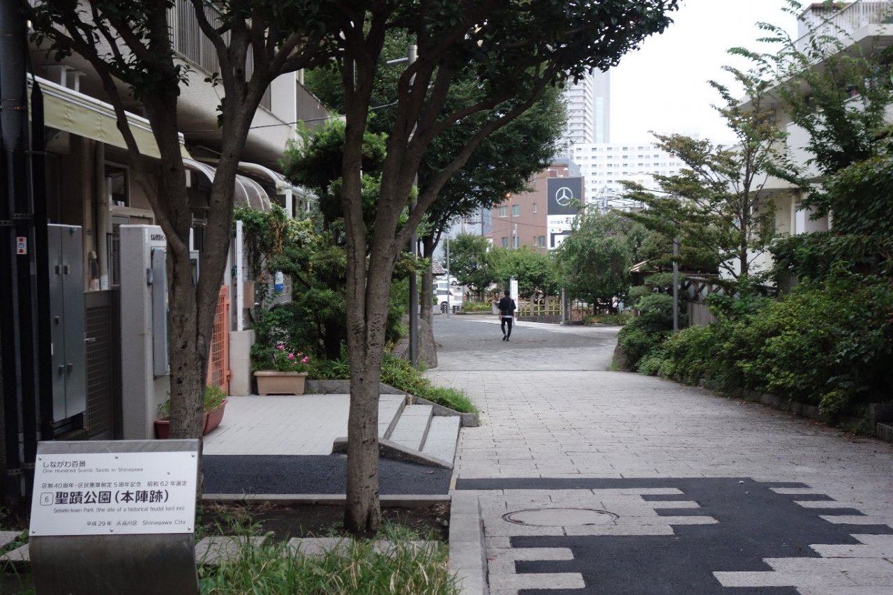 目黒川に架かる品川橋から旧東海道にある北品川商店街を進むとすぐに聖蹟公園の入り口が有りました。そこにかつての品川宿の本陣跡の説明板が置かれていたので立ち寄りました。周りは住宅地になっていて本陣の面影は有りませんが、昔の旅人にとっては重要な場所なのだと解りました。