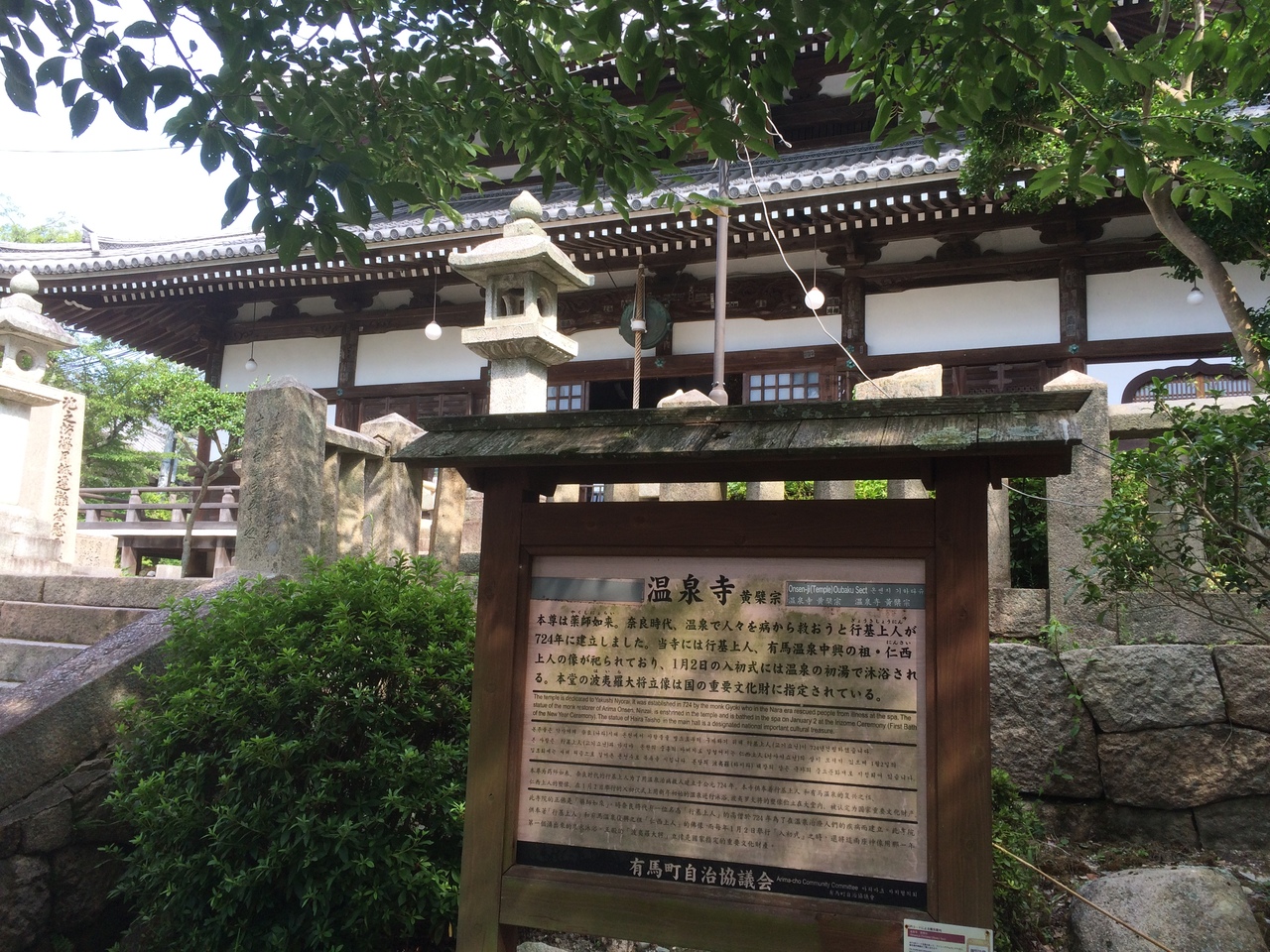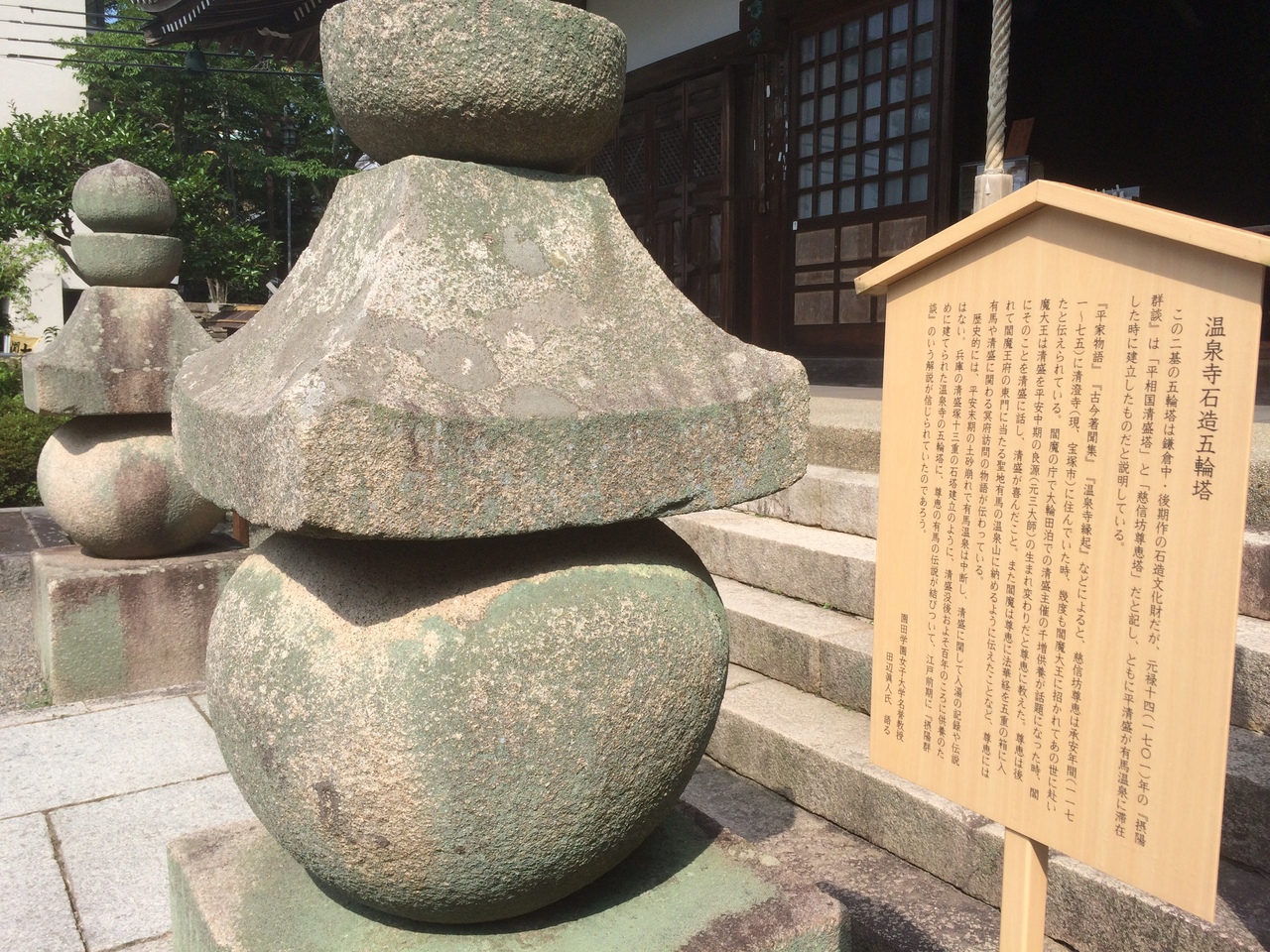 有馬温泉の少し高台にある寺で周りにも寺がありました。境内が狭く少し圧迫感がありましたが質素な寺でした。境内に魚や獅子の瓦がいくつか置いてあり、本堂の前には二つの五輪塔もあり、平清盛が有馬温泉訪問時には建立されたとのことでした。