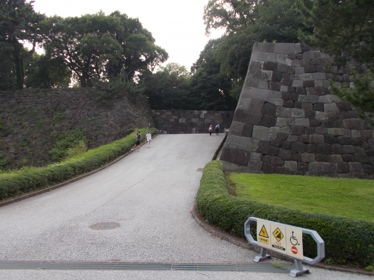 この汐見坂は本丸東側にあります。この坂を下ると二の丸になります。坂からはかつては東京湾(江戸湾)の汐の満ち引きを見ることができたのです。この坂を下ると右手に白鳥濠があります。本丸と二の丸の間にある濠です。急坂です。