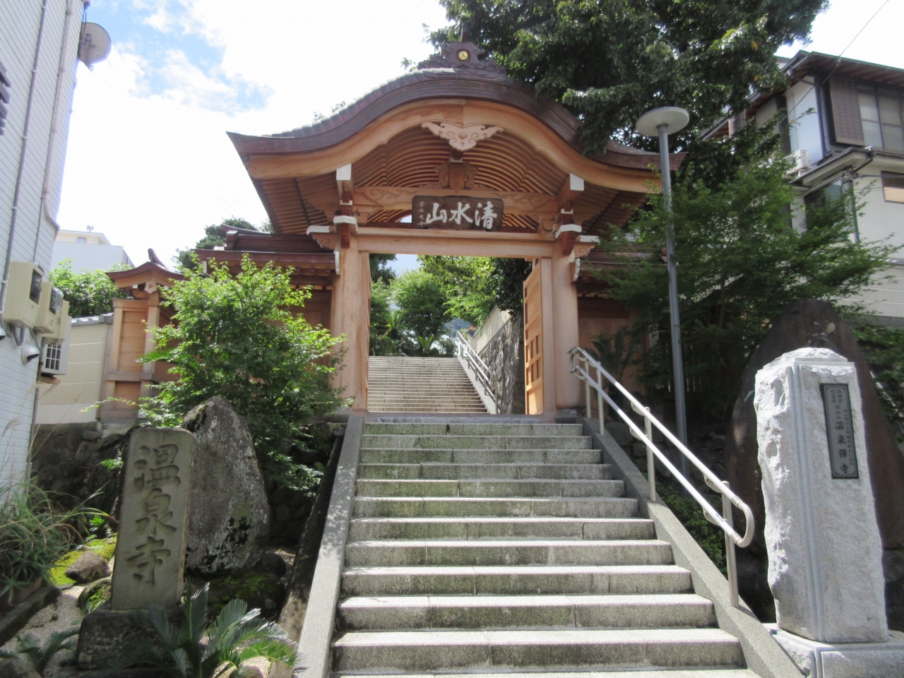 臨済宗の妙心寺派のお寺となりには浄土宗の誓欣院があります。階段の途中の山門にあった仏足が印象的でした。本堂は大きく立派でしたが、階段の上り下りが大変だろうなと感じます。また。温泉街には温泉寺というのが普通にあるものなのかもと思った。