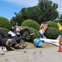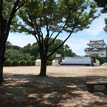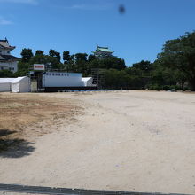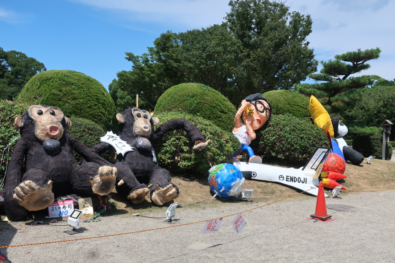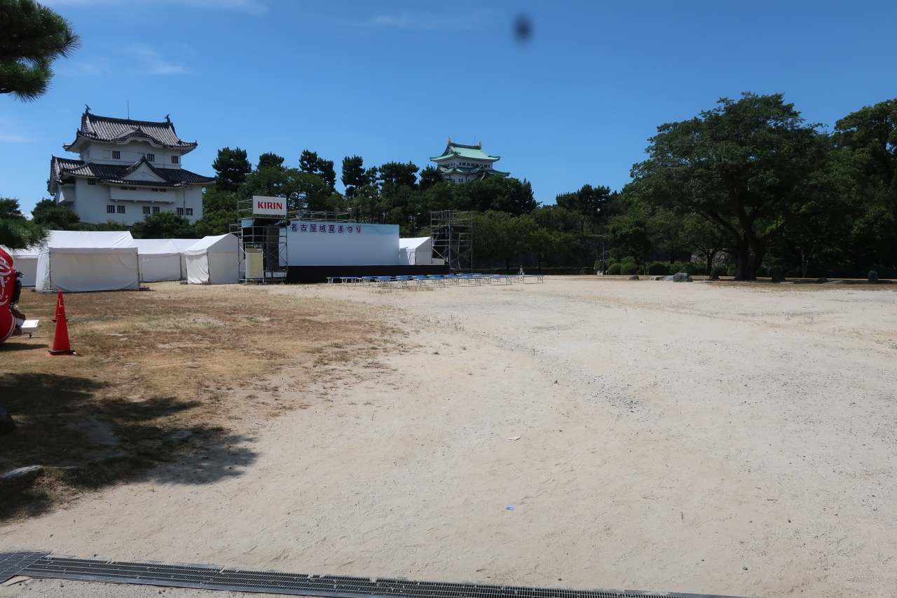 名古屋城の東南隅櫓の東側にある広場が二之丸広場です。名古屋城夏祭りの会場となっており、本丸側にステージやテントが設けられ、広場の入口では円頓寺七夕まつりで使用された名物はりぼてが展示されていました。しかし、夏祭りは夜に行われ、昼間に行っても炎天下なので疲れるだけ。見る物は円頓寺はりぼてだけです。