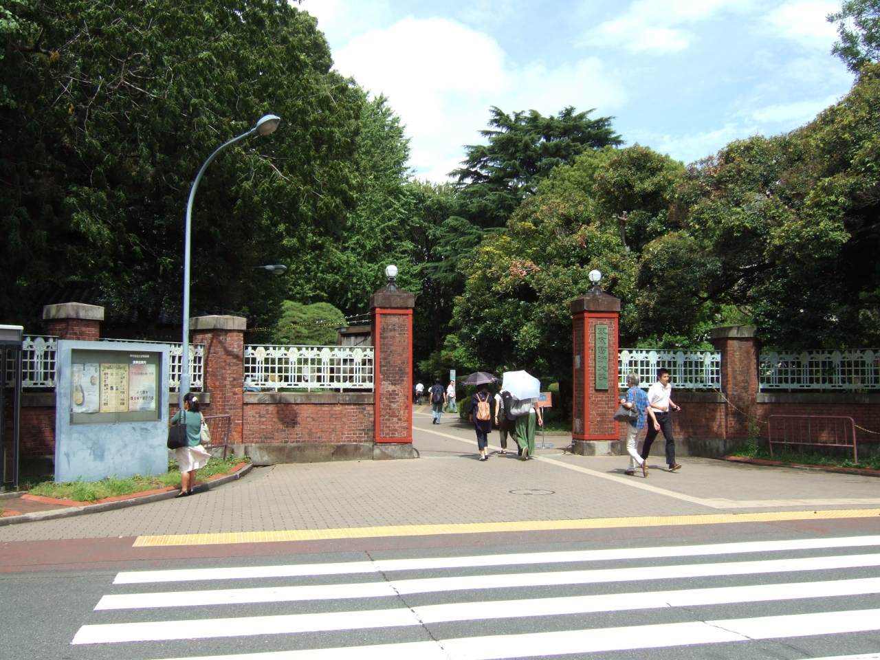 上野恩賜公園、東京国立博物館の隣にある、国立の芸術大学。音楽と美術の最高峰で、横の歩道を歩いていると、さまざまな楽器の音色も聞こえますが、ブルーシートで覆われたなにやら怪しげな彫刻をつくっている場所もあります。煉瓦の門がとても重厚です。