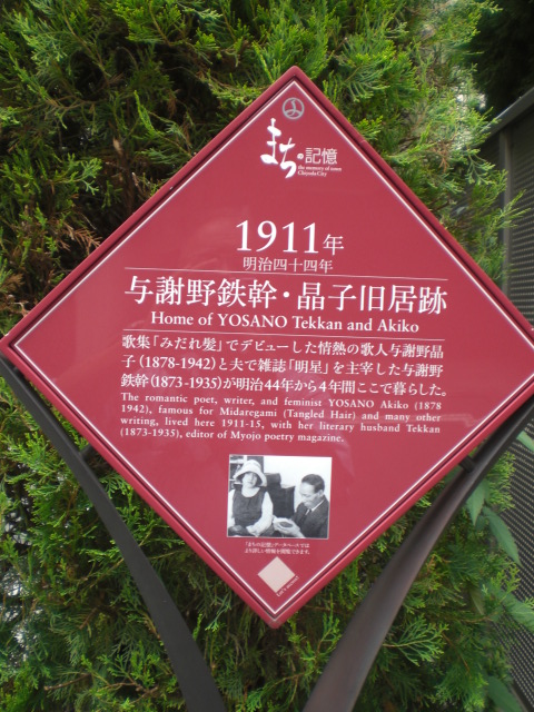 与謝野鉄幹 晶子旧居跡の標識が、武蔵野大学サテライト校の隣にあります。