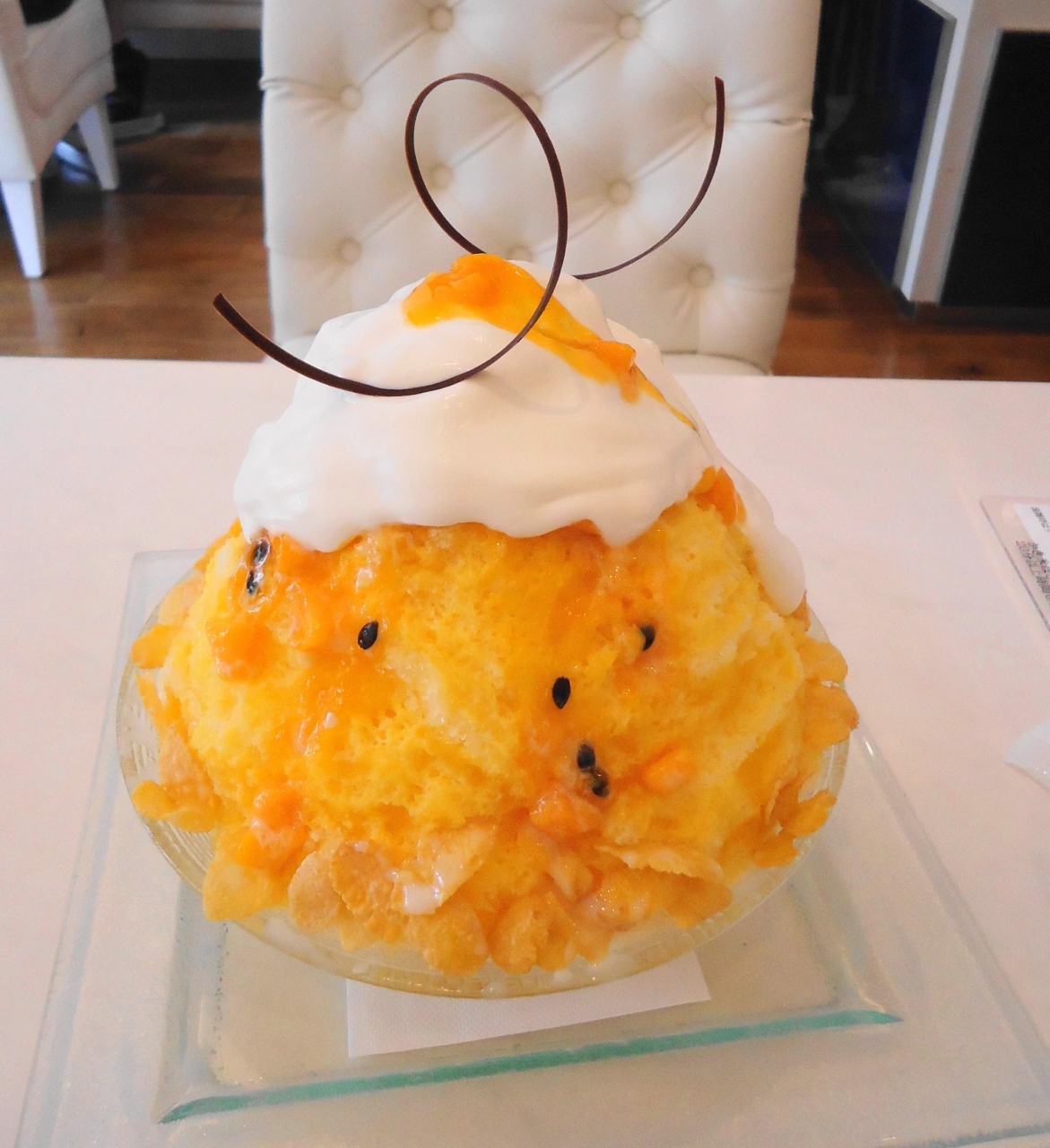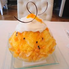 ふわっとした氷、マンゴー味が濃厚でかかっている生クリームが優しい甘さ。