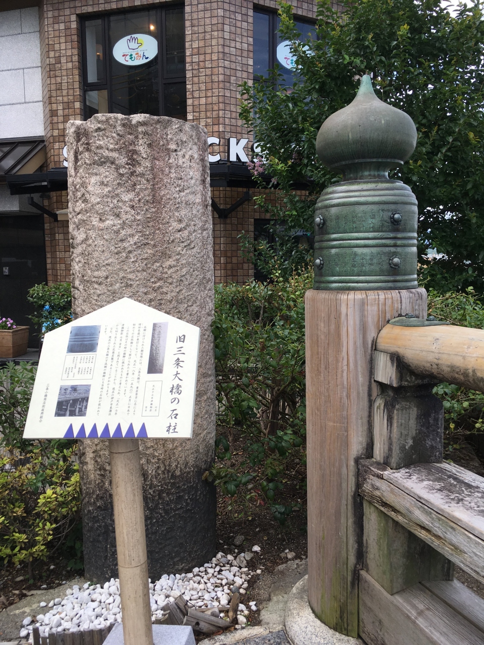 スターバックスコーヒーのたもとにある旧三条大橋の石柱ですが、パッと見た感じでは古びた石の柱にしか見えませんけど、解説(隣にきちんとあります)を読むと考えが変わります。この石柱、なんと天正18年(1590年)にできたものなんですよ。この柱は豊臣秀吉が改造命令をだした旧三条大橋のものなのです。それを知ってますます京都に興味をもちました。