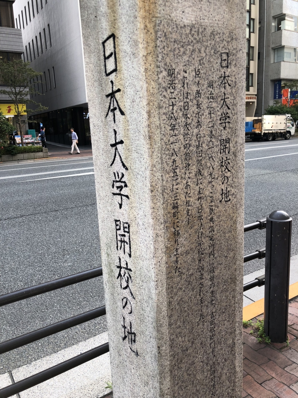 東京区政会館の前にあったのがこちらの碑。日本大学の前身、「日本法律大学」の開校がこちらだったそうです。日大って法科が最初だったのですね。非常に便利な立地ですが、今は移転してしまって大学はありません。