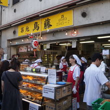 築地には、鳥めし鳥藤のお店もありますが、たぶんこれが大元。おばちゃんたちが忙しげに動き回って、鳥肉をさばいたり、焼き鳥を焼いて並べたりしています。鶏肉は鮮度が大事。回転のいい店は価値があります。ただ、ここの焼き鳥はバラ売りはなし。ちょこっと買って食べ歩きというわけにはいかないのが難点です。