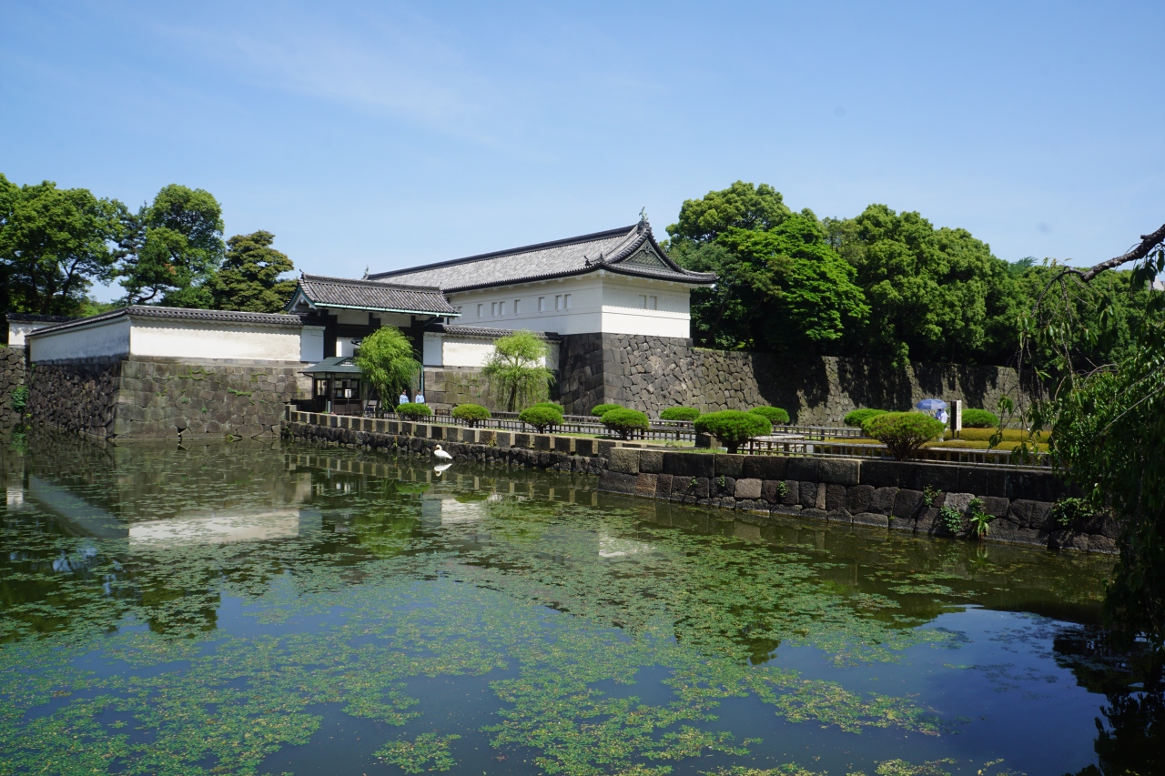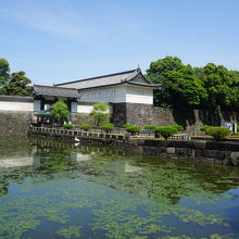 大手門橋は、江戸城の正門大手門に続く橋。これも橋脚のない、石垣を積んだ堤防のような土橋ですが、欄干に模した四角い置石が並んでいたり、点々と低木の植え込みがあったりして、それなりの潤いを感じる眺め。大手門の白い漆喰壁とあいまって、美しい眺めだと思います。