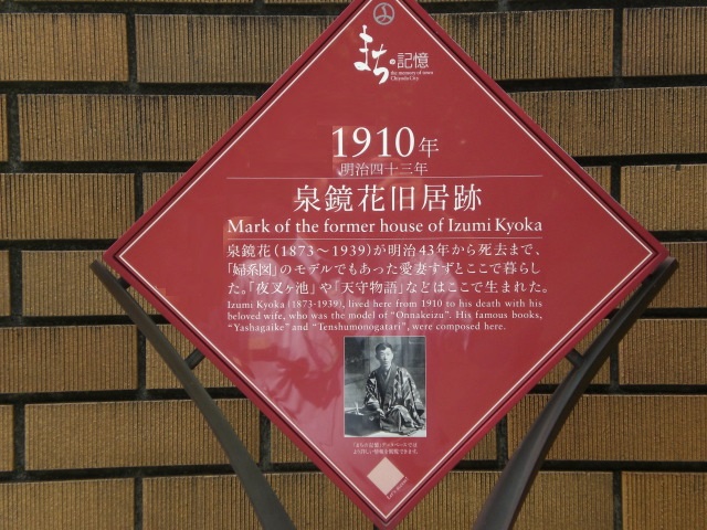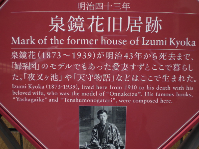 泉鏡花の旧居跡の標識には、愛妻すずとともに、文人通りの旧居に住んでいたとあります。