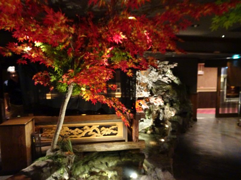 薄暗がりの中、小川が流れ、紅葉が朝やかな店内でした。雰囲気が良いです。しかし、隣が大人数のグループだったので、煩くて折角の雰囲気が台無しでした。