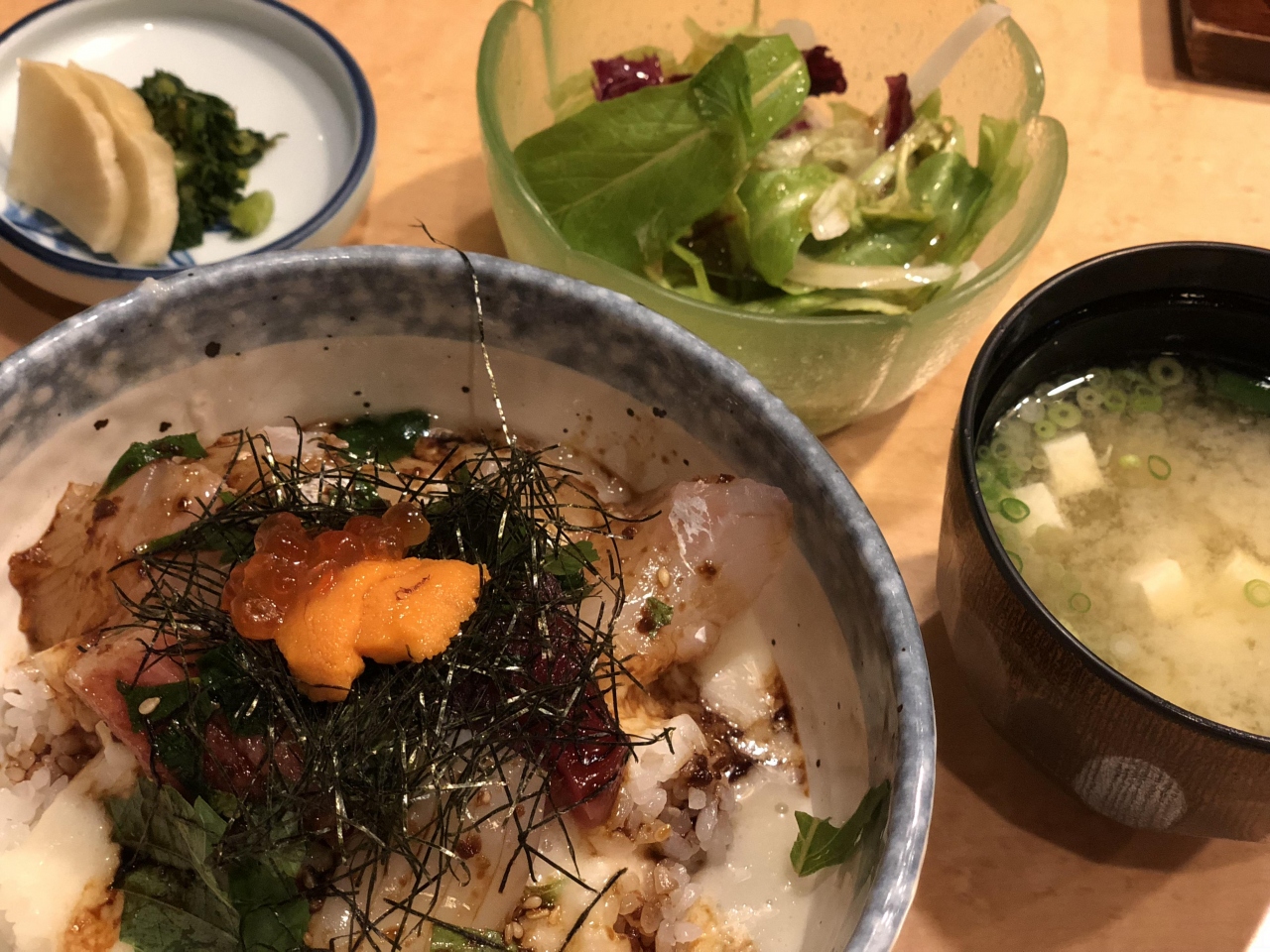 ランチに入りました。海鮮丼を注文しました。うに&いくらも乗っていて、茶わん蒸しやサラダもついていて、1300円でとてもお得な感じでした。