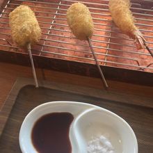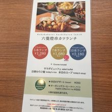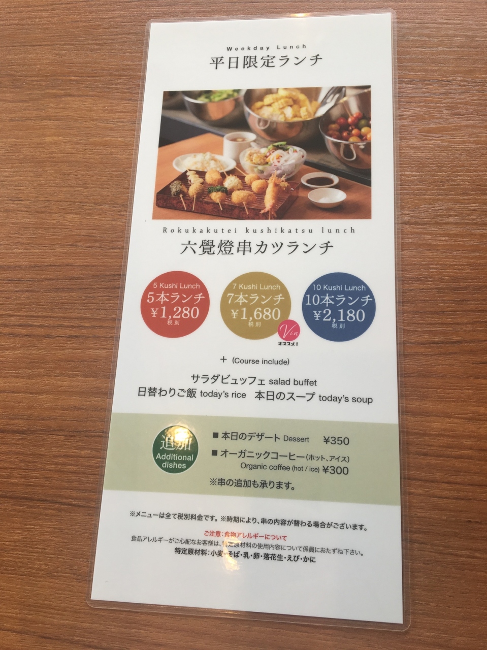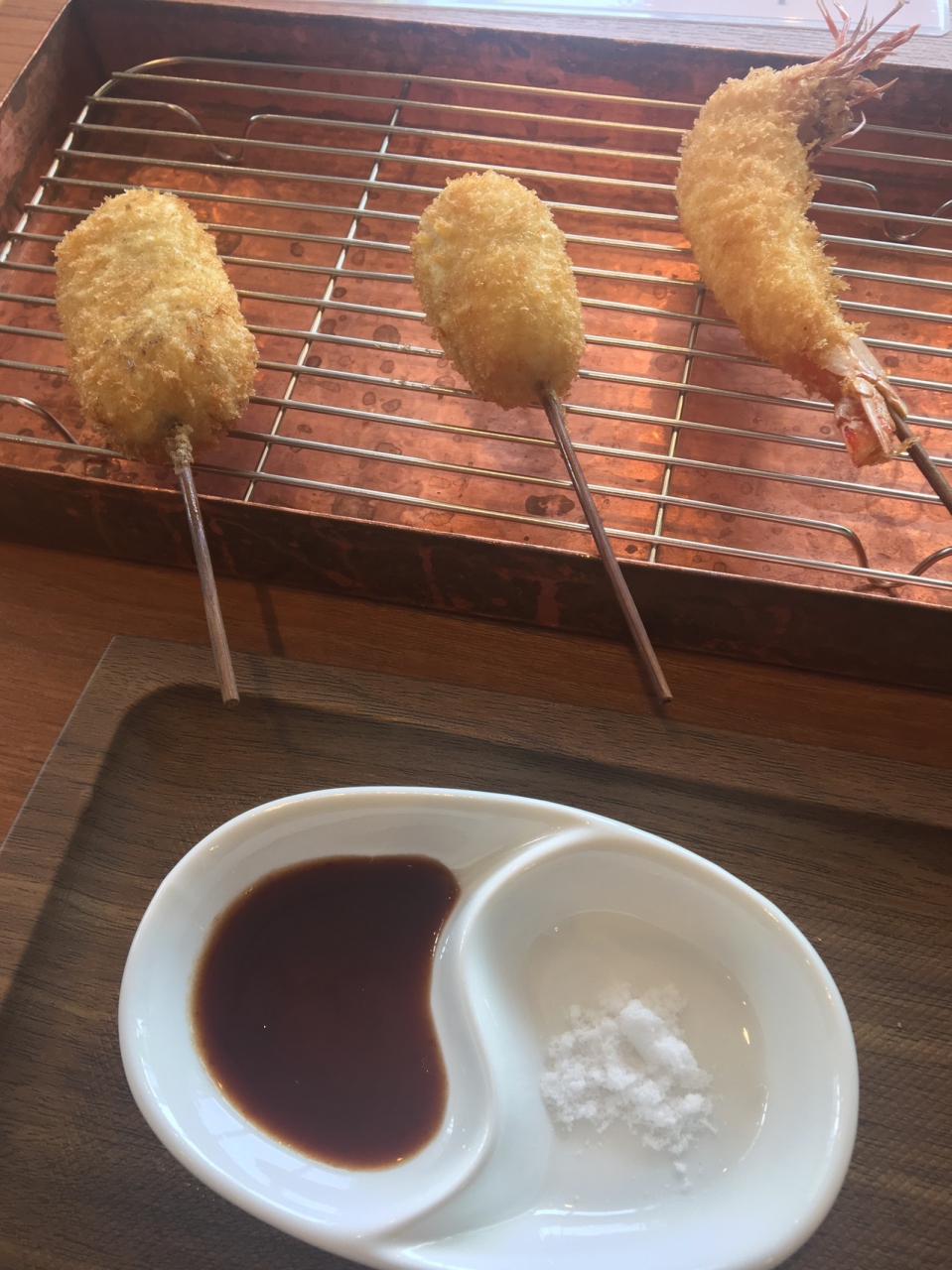 平日のランチで伺いました。予約なしで入れました。串カツ7本ランチをオーダー。サラダビュッフェは種類が豊富、野菜の産地が書いてあるのもポイント高いです。串カツの衣は軽めで、あっさりと食べられました。満足度の高いランチでした。
