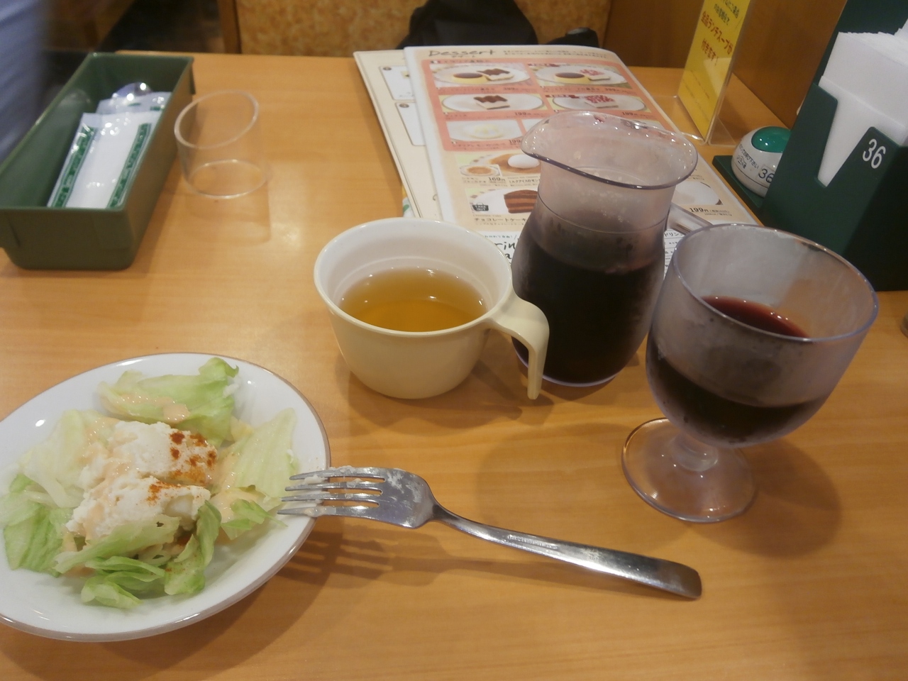 駅ビル内にあるレストラン、サイゼリアを利用した。女子高生が多い店で、どちらかと言うと避けたい店だが、ランチ時はサラリ-マンのランチや主婦友で賑わっていた。ランチメニュ-はス-プ、ミニサラダ付き、ワインのデカンタ(小)を注文しても千円以下と言う、嬉しい値段。