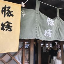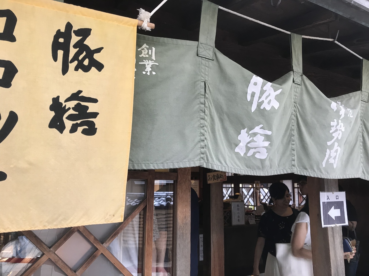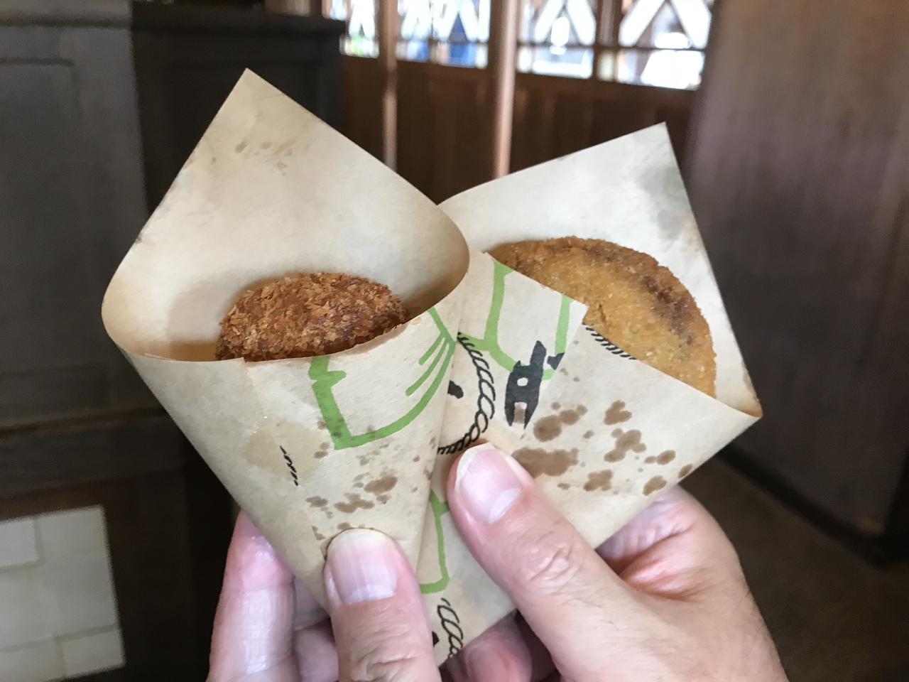おかげ横丁のメインストリートにはなく、マップをもらって横道に入っていくと、行列ができていました。昔風の店先でコロッケとメンチカツを注文。お店の人は慣れたもの、お金を払ったらすぐ紙包でわたされました。