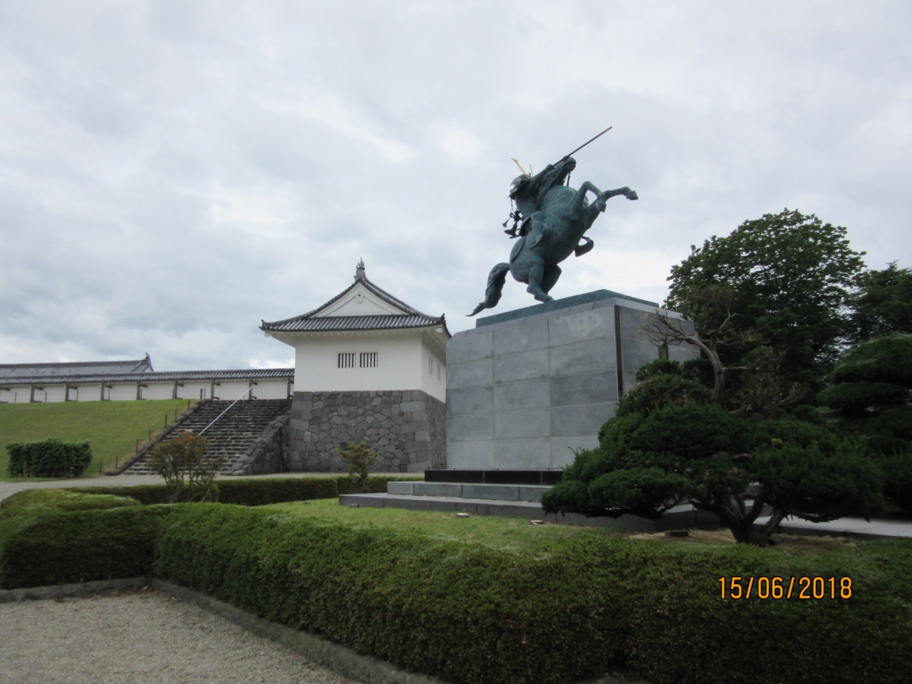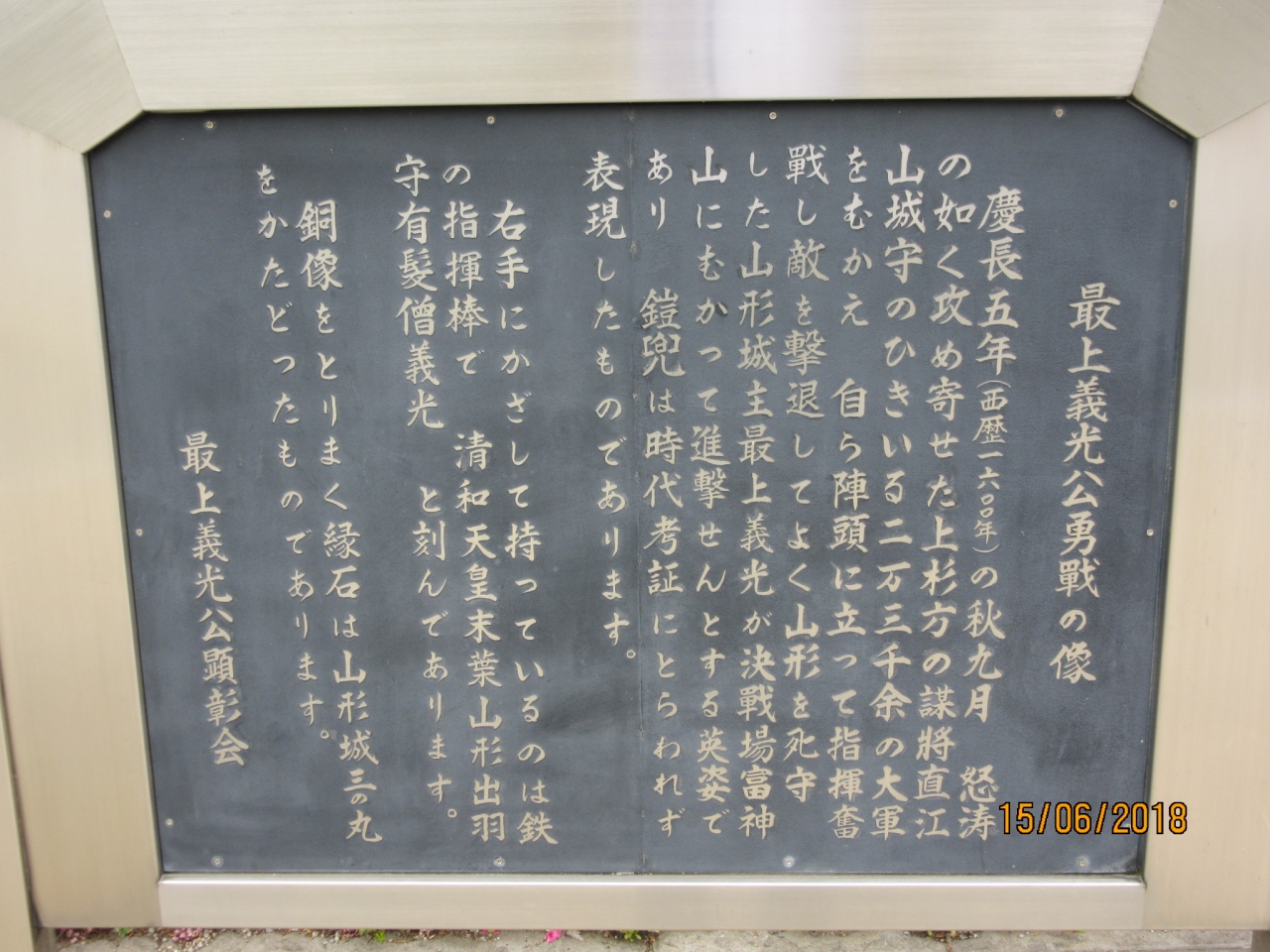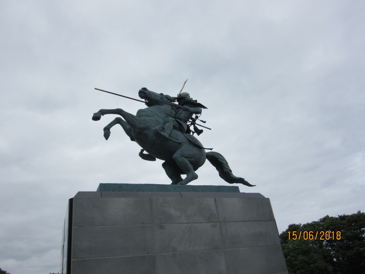 霞城公園(かじょうこうえん)内の二ノ丸東大手門近くにある騎馬像。上杉景勝の重臣で有名な【直江兼続】が攻めてきた際に、義光自ら陣頭に立って決戦に向かう勇姿をブロンズ像で作成したもので迫ってくる迫力があった。昭和52年の建立。