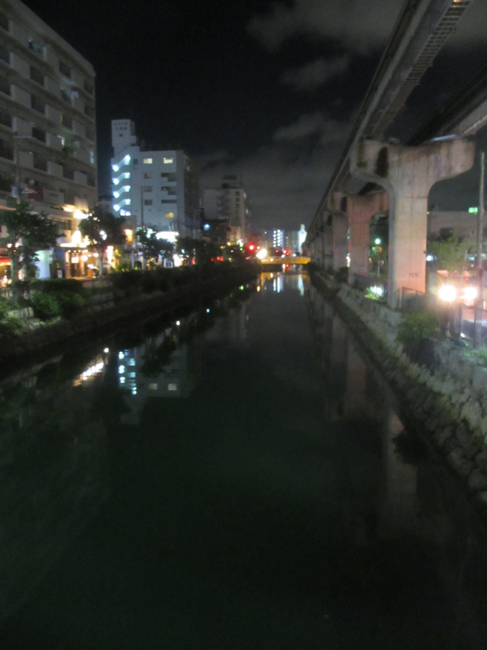 那覇市の市街地を流れている川です。夜ホテルから出て外に夕食をとりに行く際に往復ともに久茂地川を渡りました。川の付近はあまり照明はなく、結構暗かったです。細い川で特に風情があるということもなかったです。