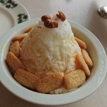 牛乳と練乳を合わせて凍らせた氷に、キャラメルソースをかけてビスケットと大豆をトッピング。
