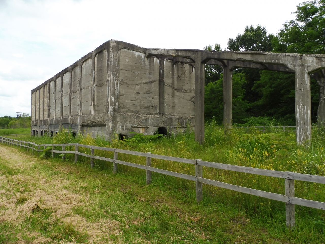 ズリ山階段入口前の広場横に長方形のコンクリートの建物及び傾斜のあるコンベアの跡が残っていて原炭ポケットと言う掘り出した石炭を一時保管する為の建物の遺構だけが残っています。