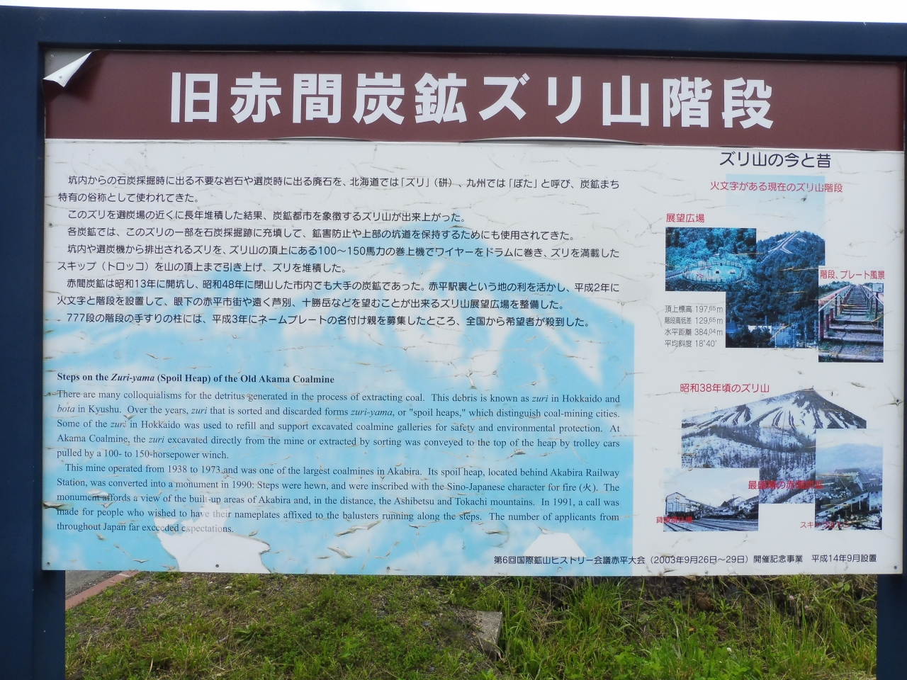 ここのズリ山は国内最大級のズリ山らしいのですがこれが人工物には見えないほど自然に返ってます。階段入口前に「熊出没注意!」の看板が有りそちらの方が気になって気になって・・・