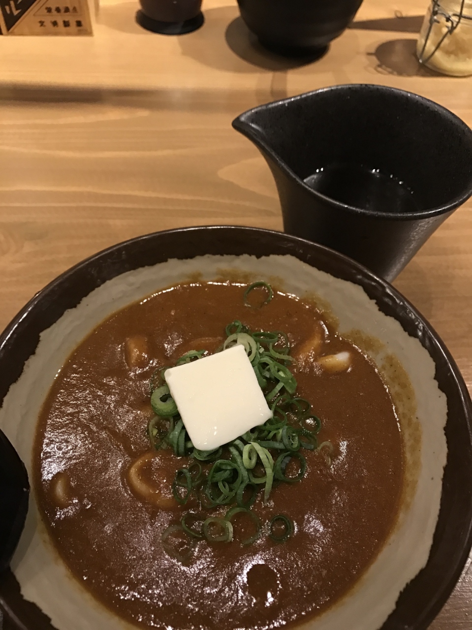 看板メニューの一つ、カレーうどんを食べました。どろっとした濃厚なカレーにバターがトッピングされています。ピリッとした辛さです。お出汁を追加すると、出汁の味が強いです。うどんを食べ終えてさらに出汁を注ぐと蕎麦湯感覚になります。最後、辛さで口の中がヒリヒリになりました。