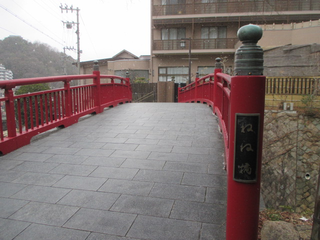 有馬温泉の観光案内所の近くの有馬川に架かる橋です。欄干が赤で、手前のポールに「ねね橋」とあります。有馬温泉の中心にあり、見逃すことは絶対にありません。なぜならこの橋のたもとには、着物が非常に精巧に作られているねねの像が建っています。1番人気の観光名所です。黒山の人だかりでした。